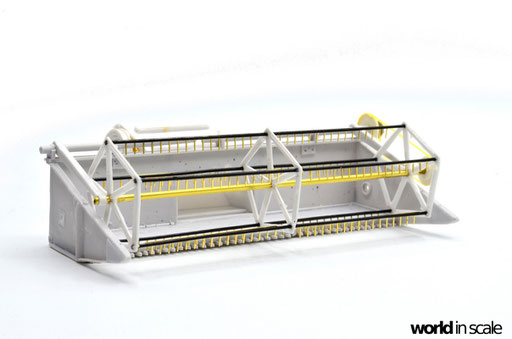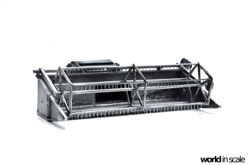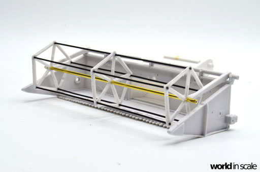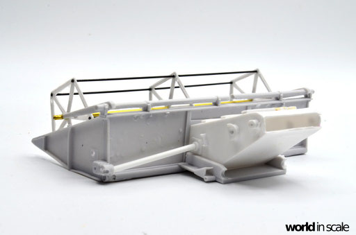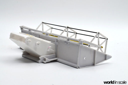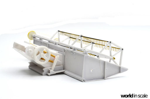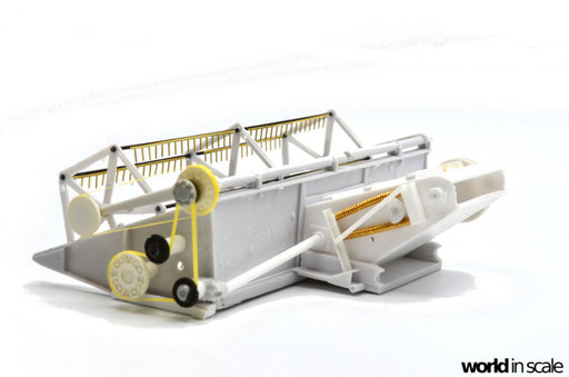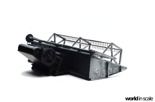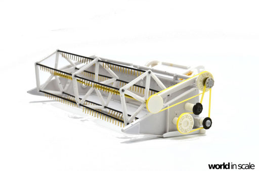 Die aus zwei Resinteilen bestehende Treppe muss zunächst in einem heißen Wasserbad gerichtet werden, da diese beiden Teile vollständig verzogen und verbogen waren. Nach dem Ausrichten wird die Treppe am seitlichen Laufgang montiert. Aus Draht wird das Geländer gefertigt und mit den senkrechten Stützen verlötet. Montiert ist das Geländer in zuvor gebohrten Löchern. Sämtliche Antriebsriemen werden aus zugeschnittenen, schmalen Tape-Streifen gefertigt, an den Laufrollen fixiert. Es sind weitaus weniger Riemen als im Original, allerdings für die Darstellung ausreichend. Nach der Lackierung werden diese nochmals gespannt und mit Sekundenkleber stabilisiert.