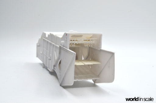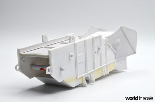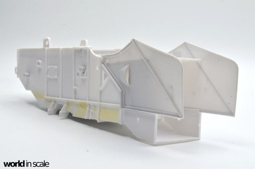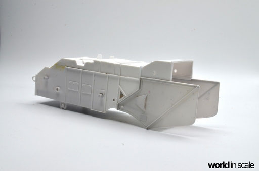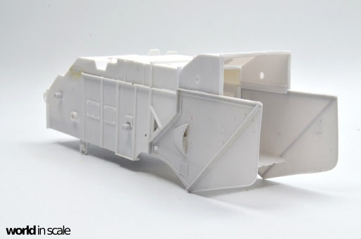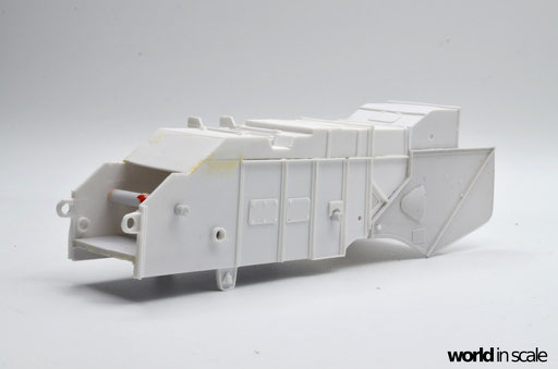 Ohne Bauanleitung geht es also los. Zunächst werden die Hauptbauteile zusammengesetzt - Bodenplatte, Seitenwände und Deckel, sowie die beiden Seitenteile, Bodeneinsatz und obere Abdeckung des Strohauswurfs. Aus Plastikprofilen und Platten werden zusätzliche Verstrebungen und Versteifungen eingesetzt, Spachtelarbeiten sind ebenfalls notwendig, da einzelne Bereiche Unebenheiten aufweisen, oder Spalten zwischen den Bauteilen zurück bleiben. Der gesamte Bereich des Strohauswurf ist in dem Bausatz leer, es fehlt das komplette Innenleben, sowie auch der aus Streben zusammengesetzte Korb am Heck - all das muss in Eigenregie erstellt werden, wenn man das Modell realistisch darstellen möchte. Hierzu im nächsten Step.
