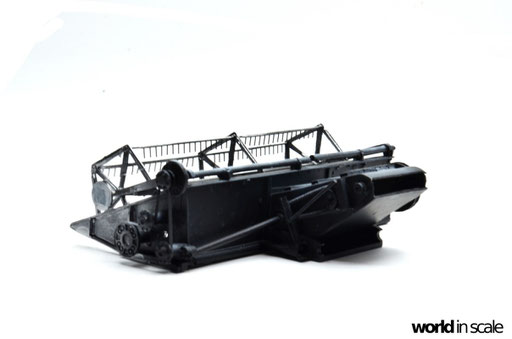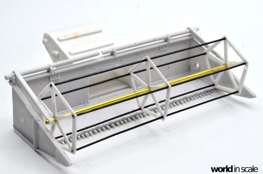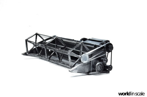 Die weitere Montage des Fahrzeugs erfolgt im nächsten Schritt. Die Antriebsriemen aus schwarz lackiertem Tamiya Tape, die Fensterscheiben aus passend zugeschnittener, klarer Folie, Scheinwerfer und Warnleuchte aus der Restekiste, sowie die letzten Teile am Motor aus dem Bausatz. Der Mähbalken wird in angehobener Position verklebt, Hydraulikzylinder von der Unterseite ergänzt, sowie auch die Antriebsriemen als Verbindung. Die Förderschnecke wird separat gealtert und anschließend hinter der Haspel verklebt. Das Fahrzeug ist in diesem Zustand schon weitgehend fertig und muss dann noch gealtert und verschmutzt werden.