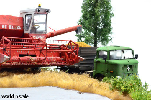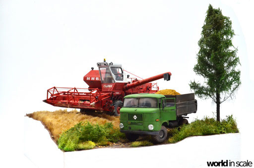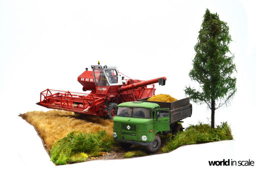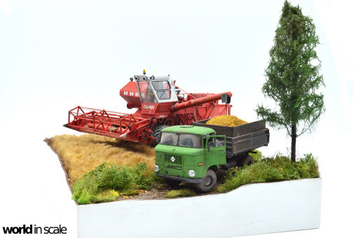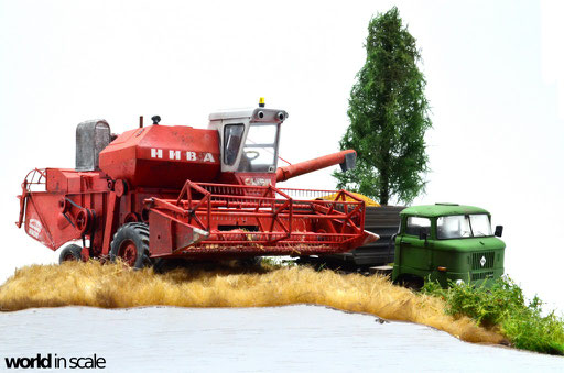 Zunächst wird das Gelände grob geformt. Es soll den Rand eines alten, unebenen Getreidefelds darstellen, mit gräserner Böschung, einem Feldweg, auf dem der zu beladende IFA W50 (von Balaton Modell - Entstehung siehe hier) soeben von dem Mähdrescher befüllt wird. Nach langer Überlegung, die am Ende ohne wirklich überzeugende Ergebnisse geblieben ist, wird dann das Getreidefeld aus einem gekämmten, mit Sprühkleber borstig gestaltetem Kunstfell dargestellt, welches auf die passende Länge gestutzt und später noch vereinzelt lackiert werden wird. Nicht die perfekte Lösung, aber doch "annehmbar", wie ich finde. Die Verkleidung der Außenseiten mit Holzplatten wird weiß lackiert. Der Grünstreifen und die Böschung werden mit Gras und Büschen bepflanzt, im linken, vorderen Eck wird ein kleiner Baum angebracht, um noch ein höheres Element zu erhalten.