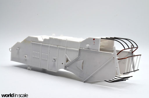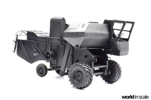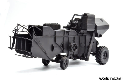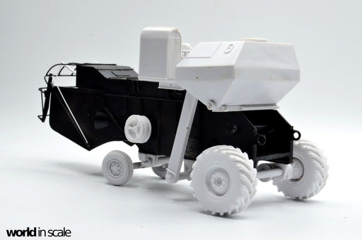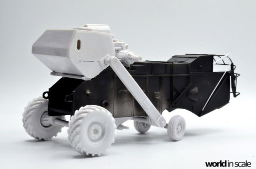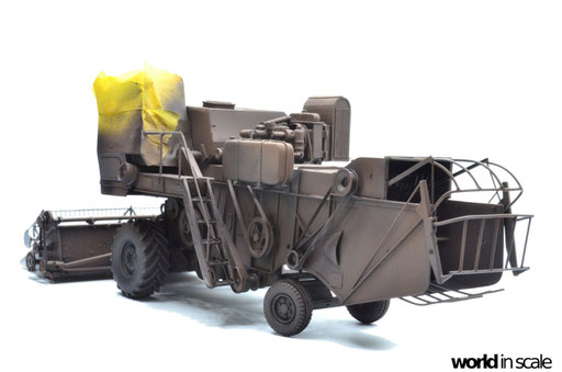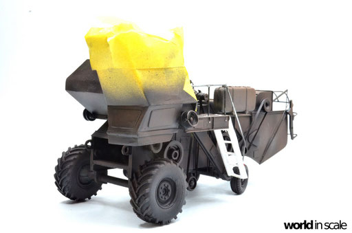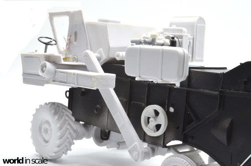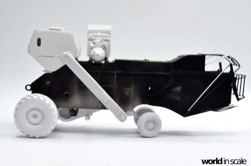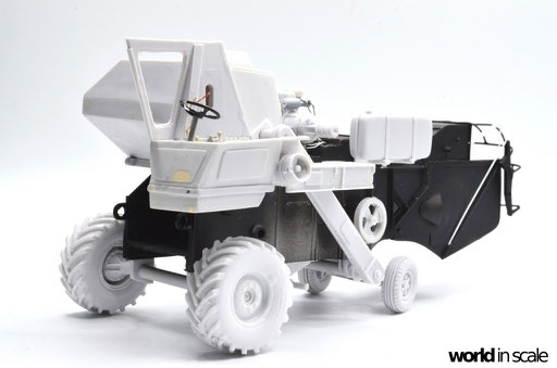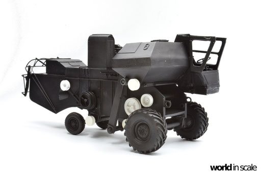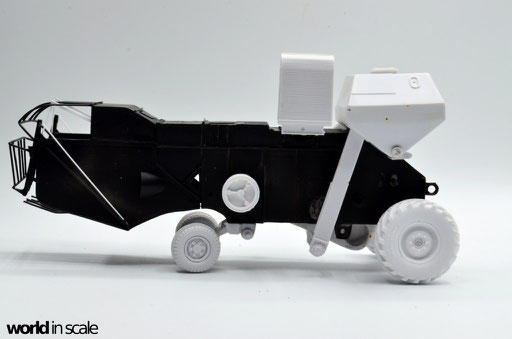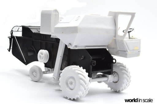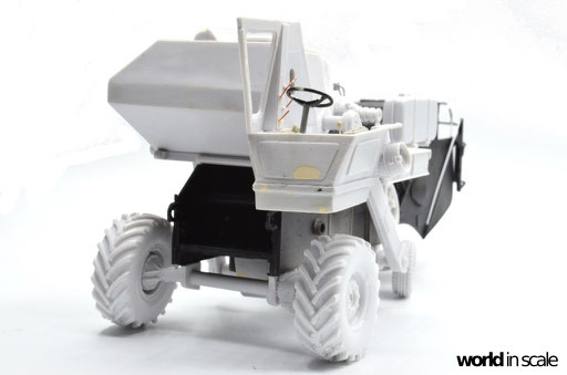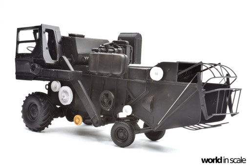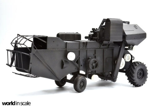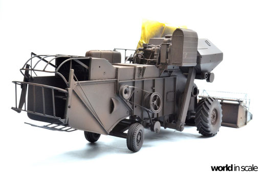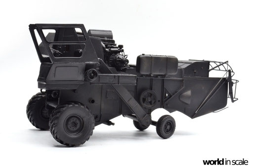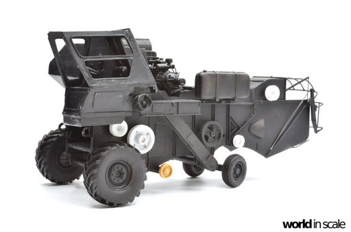 Nachdem der Heckbereich fertig gestellt ist, wird das bisherige Modell schwarz grundiert, um somit eventuelle Unebenheiten erkennen zu können. Passt alles, folgen weitere Resinteile aus dem Bausatz - Achsen, Antriebsteile im unteren Fahrzeugbereich, wobei hier noch feinmaschiges Gitter angebracht wird. Die Hinterräder werden eingelenkt dargestellt und erhalten noch Teile des Lenkgestänges aus Draht gefertigt. Am Kornbehälter auf der Fahrzeugoberseite müssen einige Luftblasen verspachtelt und verschliffen werden, dann wird dieser auf am Fahrzeug montiert. Der Motorblock samt Kühlaggregate folgen direkt dahinter, hier werden dann noch einige Kleinteile und Leitungen im nächsten Schritt ergänzt. Seitlich sind weitere Teile ebenfalls ergänzt, ebenso weitere Details am Heck. Ohne Bauplan sind hier Fotos des Originalfahrzeugs unerlässlich - ansonsten wäre der Bau nicht möglich.