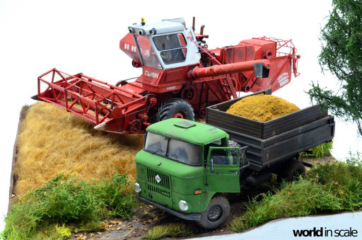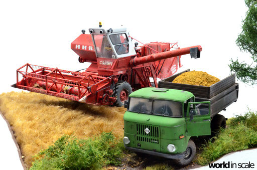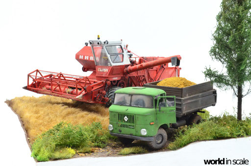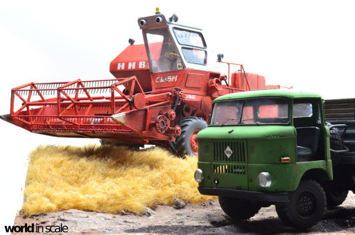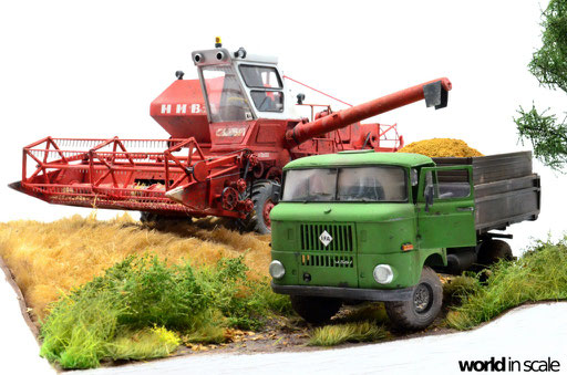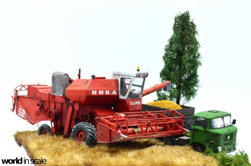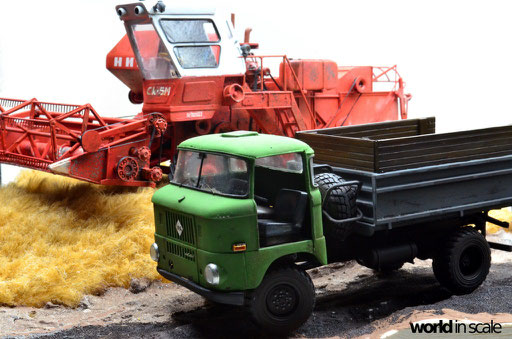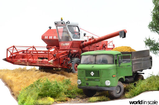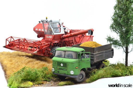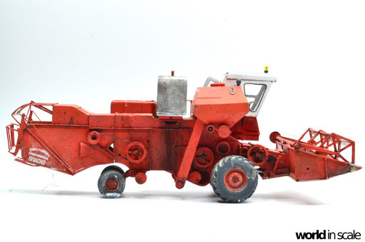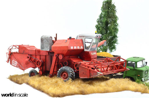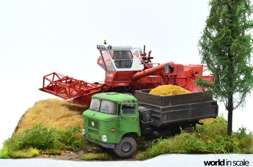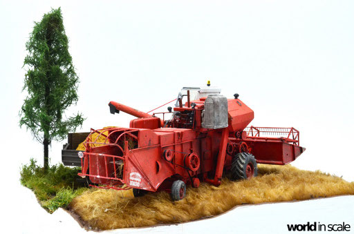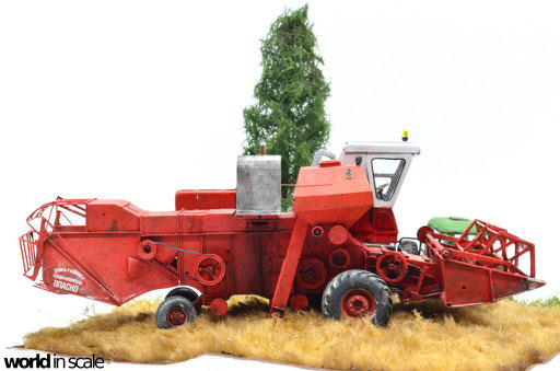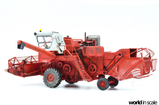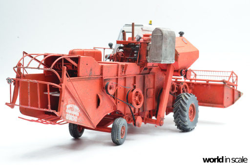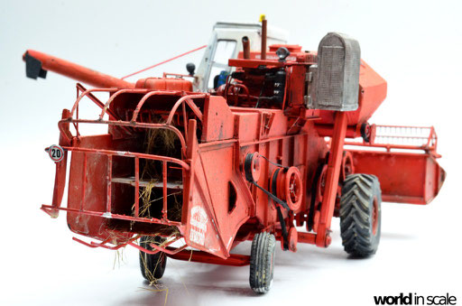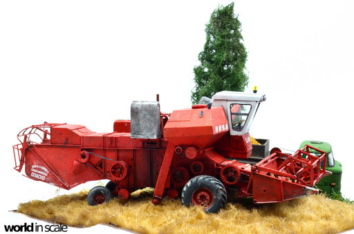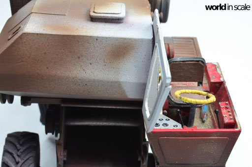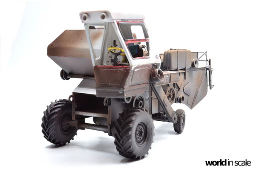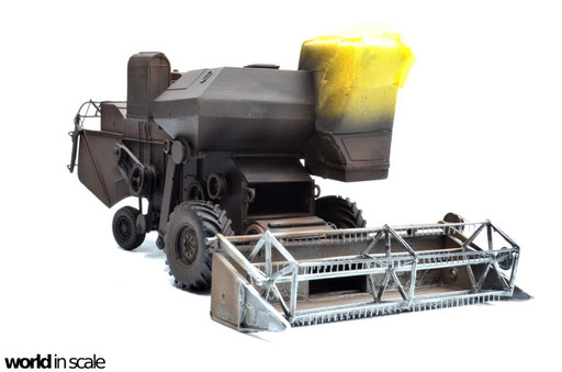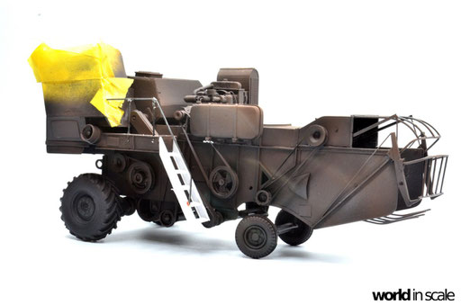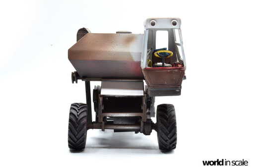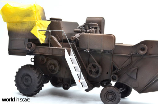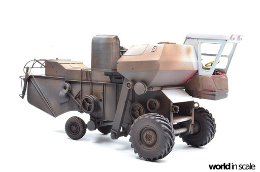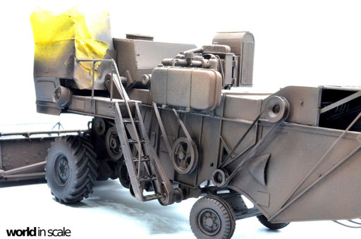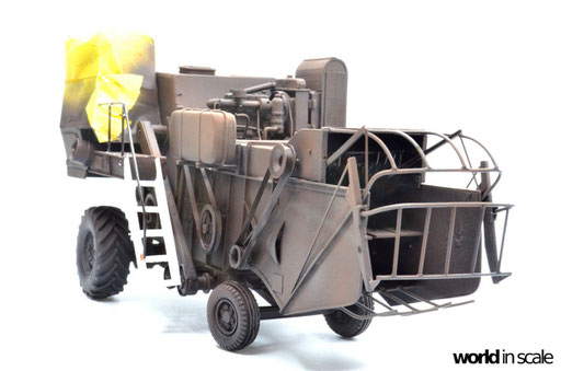 Mit diversen Washings aus Ölfarben (Braun, Beige, Weiß) wird das Modell gealtert, dann mit Pigmenten verschmutzt. Ausgelaufenes Öl, Schmierfett und Kraftstoff wird mit Produkten von AK Interactive und auch mit Ölfarben dargestellt. Klein zugeschnittene Stücke Flachs werden verwendet, um Reste von Getreide und Stroh darzustellen, bevor abschließend die letzten noch fehlenden Bauteile ergänzt werden. Der Auspuff wird stark verrostet, die Räder mit Pigmenten passend zum Untergrund verschmutzt um diese einheitlich darzustellen.