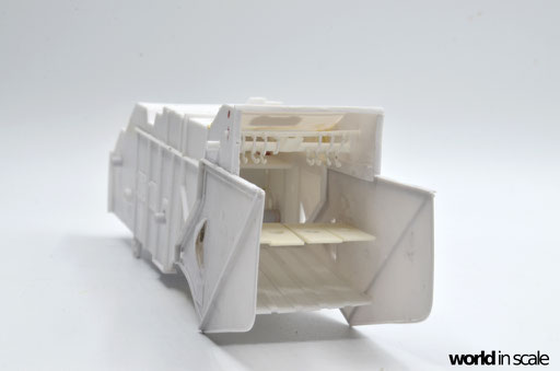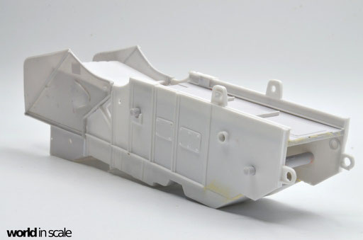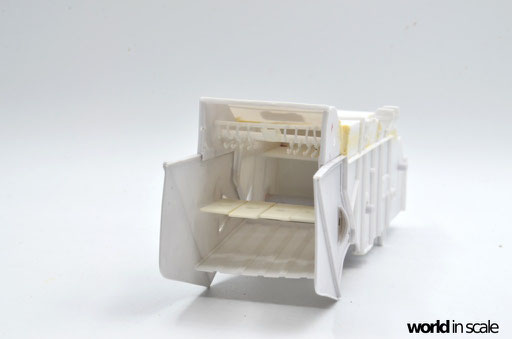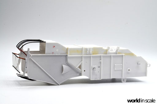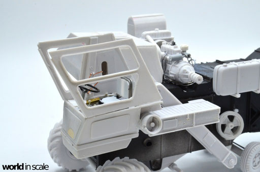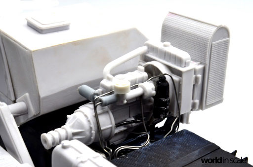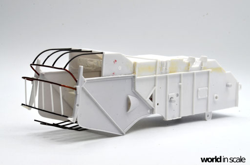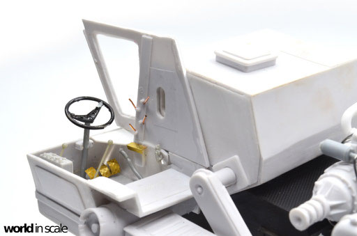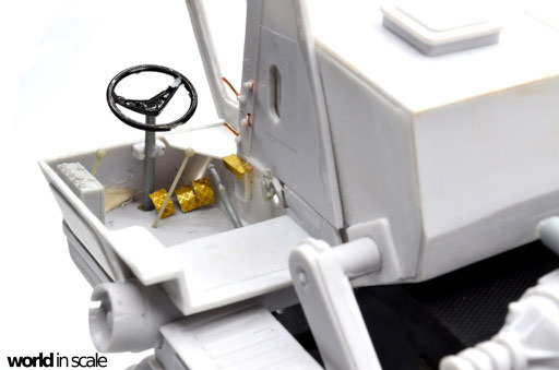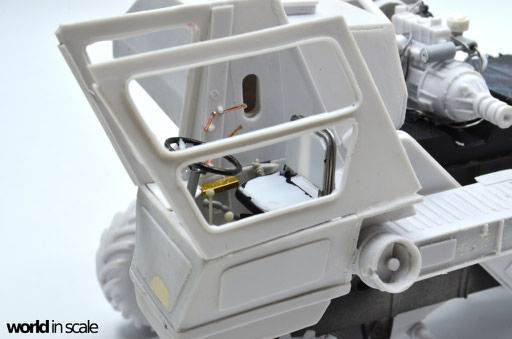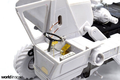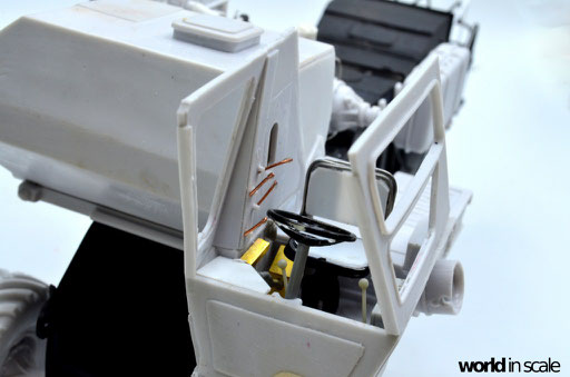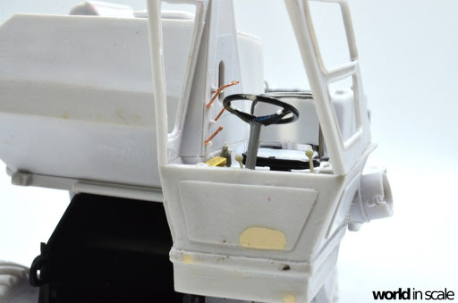 Während der Motor aus nur wenigen relativ gut detaillierten Einzelteilen besteht und auch den Kühler beinhaltet, fehlen doch einige Bauteile und Leitungen, die bei dem offenen Motor später gut einsehbar bleiben. Diese Details werden aus Teilen aus der Restekiste, Draht und Plastikprofilen ergänzt. Der Innenraum der Fahrerkabine ist im Bausatz vollständig leer - es liegen kein Lenkrad, keine Schalter und Hebel, keine Anzeigen bei, nur ein völlig unpassender Fahrersitz. Alle Details werden daher neu aufgebaut, ein überarbeitetes Lenkrad eines 1:24 PKW-Modell findet Verwendung, der Sitzt wird vollständig neu aufgebaut. Der Innenraum wird dann lackiert, bevor die noch fehlenden Seitenteile montiert und die Fenster verglast werden. Man sieht auch hier einige Bereiche, die verspachtelt und nachgearbeitet werden mussten.