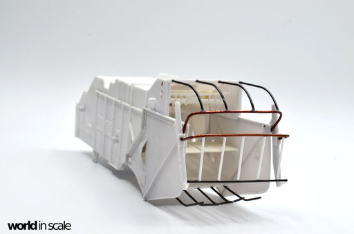 Im Innenbereich werden zwei Rohre eingesetzt, sowie ein dünner Querträger im oberen Bereich. Aus schmalen Kunststoffprofilen werden die einzelnen Zinken hergestellt und an den oberen Rohren / Querträgern montiert. Anschließend wird der gesamte Heckkorb aus Draht, unterschiedlicher Stärke und Plastikprofilen erstellt. Die Drahtstücke werden hierzu zunächst in Form gebogen, abgelängt und in zuvor gebohrten Löchern fixiert. Der bewegliche Teil am Heck wird aus Draht und Kunststoffprofilen erstellt und absichtlich leicht schief montiert - das Modell soll einen stark gebrauchten Zustand später vermitteln. Die untereren Drahtstücke werden nach dem Biegen von unten unter der Bodenplatte fixiert - jetzt wirkt der gesamte Bereich interessanter und realistischer als das leere Ausgangsmodell. Es fehlt nun noch das weitere Steuerungsgestänge.