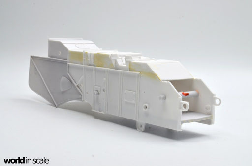 Das soweit zusammengesetzt Modell wird dann vollständig in schwarz grundiert - hierfür kommt Vallejo's Black Primer erneut zur Anwendung. Wichtig sind hier nun speziell die Bereiche, die entweder überarbeitet, scratch-gebaut, oder später nicht mehr zugänglich sein werden. Der Innenraum des Fahrerhauses wird im nächsten Schritt bereits in seiner endgültigen, orangeroten Farbe lackiert, die Details bemalt und der Innenraum vollständig fertig gestellt und gealtert werden, bevor dann die Fenster aus klarer Folie eingepasst und von innen eingeklebt und maskiert werden.