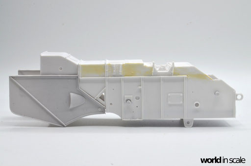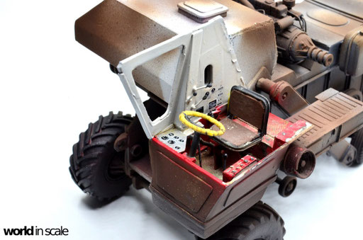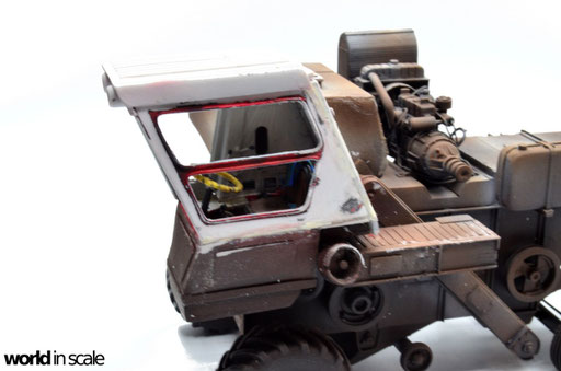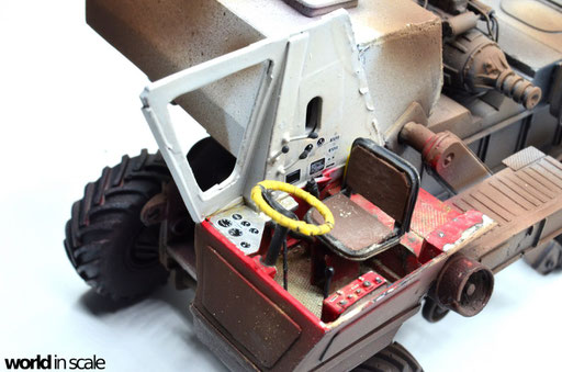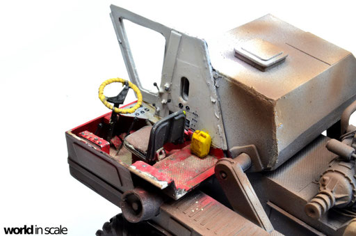 Der Innenraum des Fahrerhauses wird dann in den jeweiligen Farben lackiert: Bodenbereich sowie untere Teile der Seitenwände in Rot, oberer Bereich in Weißgrau - jeweils von Vallejo. Anschließend wird der Sitz in Schwarz mit braunem Bezug bemalt, die Hebel in Schwarz, Schalter und Knöpfe in Silber, Rot, Grün und Gelb. Das Lenkrad erhält nach der Bemalung eine Umwickelung mit dünnen Streifen Tamiya Tape. Sämtliche Decals für die Anzeigen, sowie die Beschriftung der Knöpfe stammen aus der Restekiste, vorrangig von Trumpeter's Bausatz des ATT. Nach einem Auftrag mattem Klarlack folgt ein beige farbenes Washing, sowie anschließend beigefarbene Pigmente. Eine Flasche auf dem Fußboden, ein gelber Ölkanister, sowie einige zerknüllte Zeitungen finden noch ihren Platz, bevor dann die zweite Seiten- und die Rückwand montiert, verspachtelt und verschliffen werden.