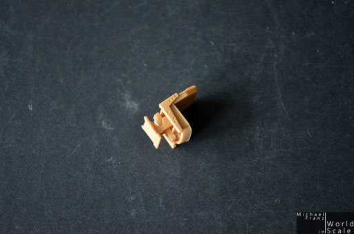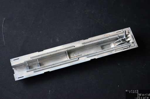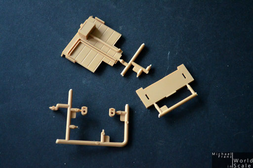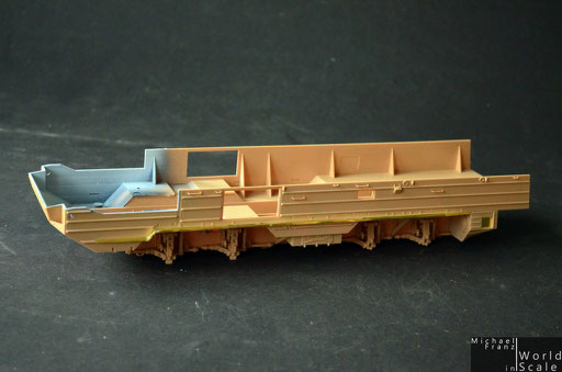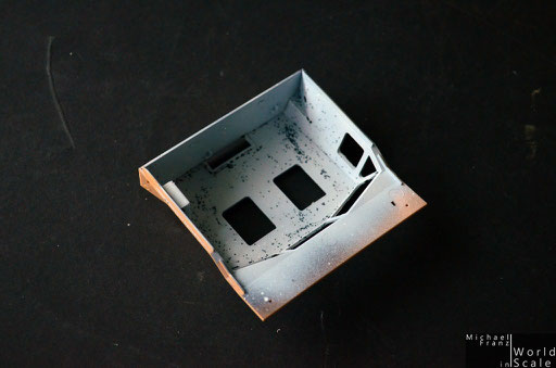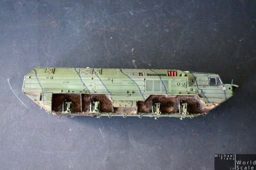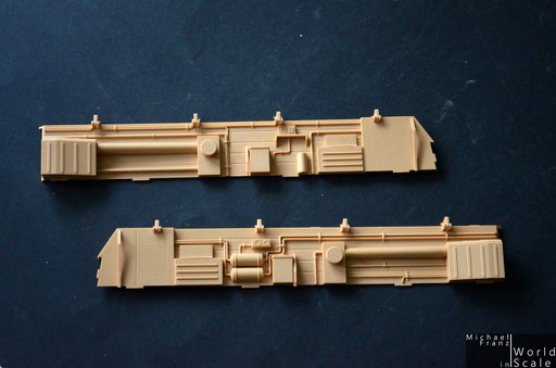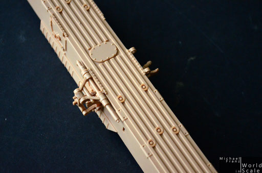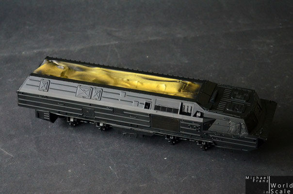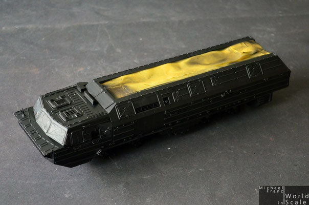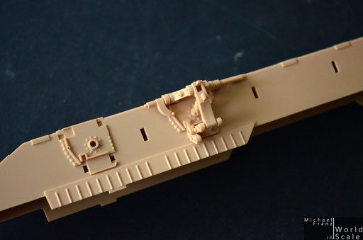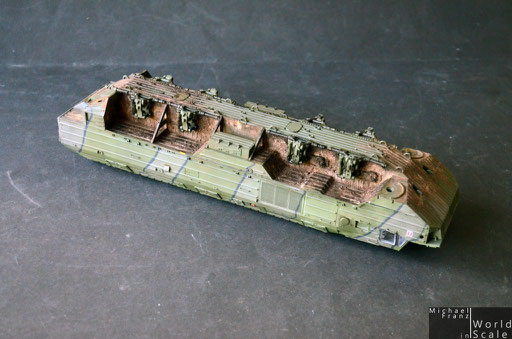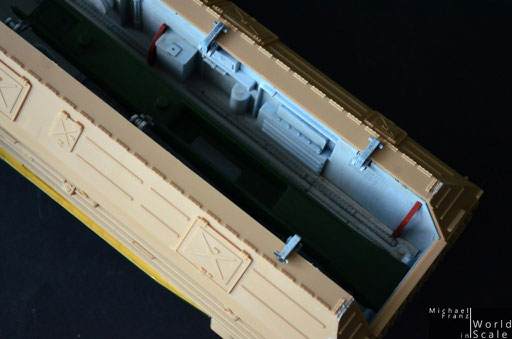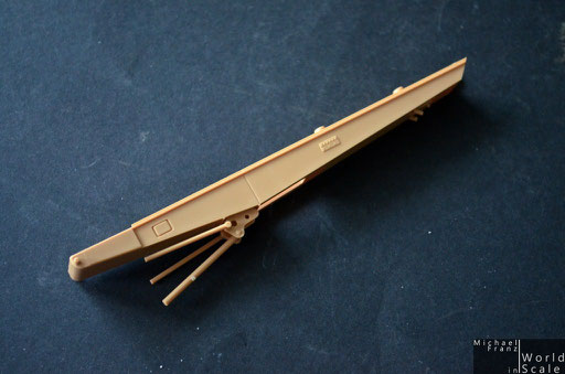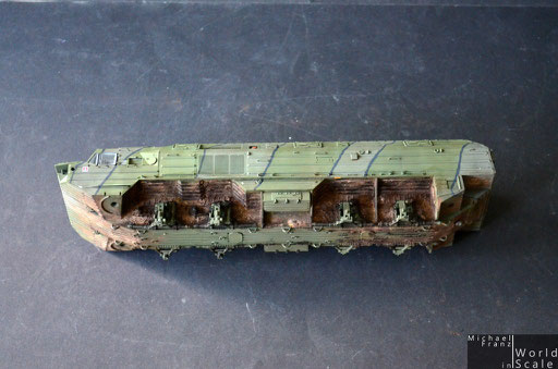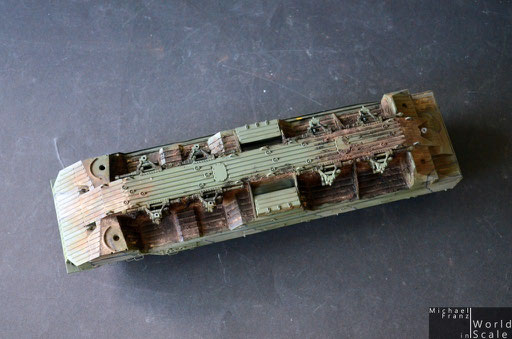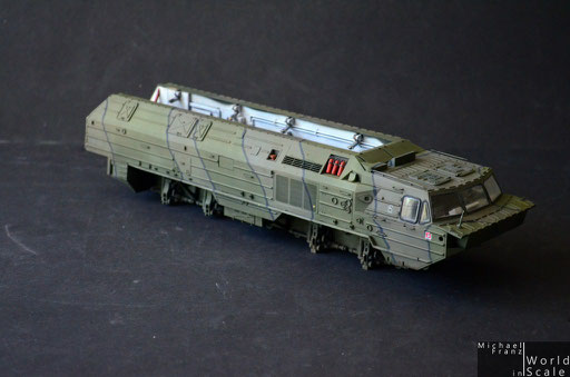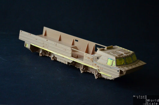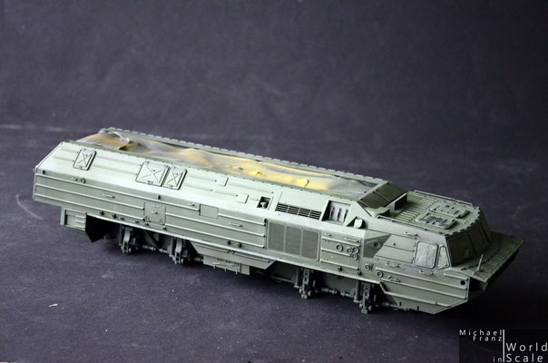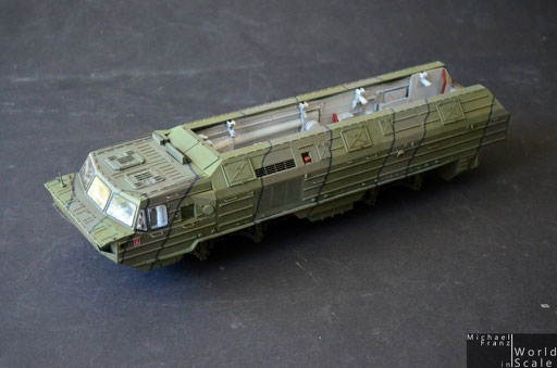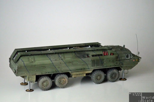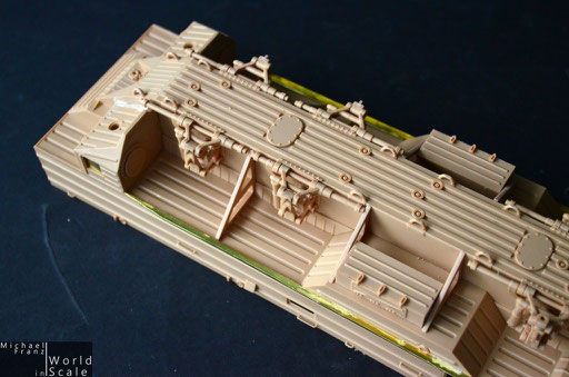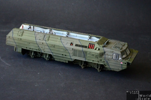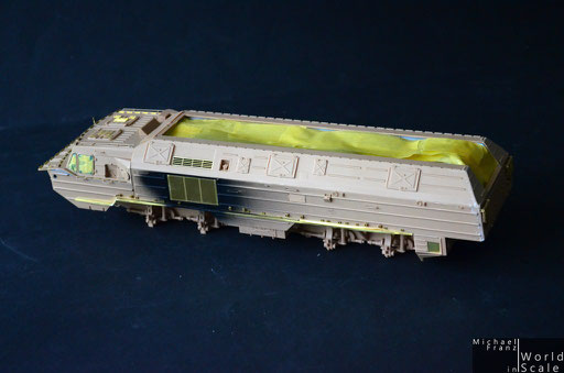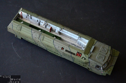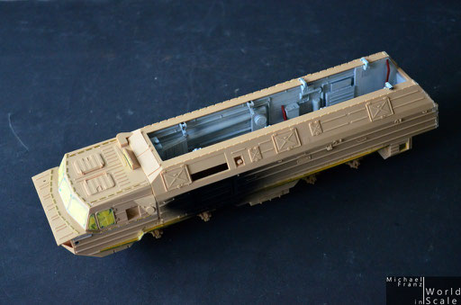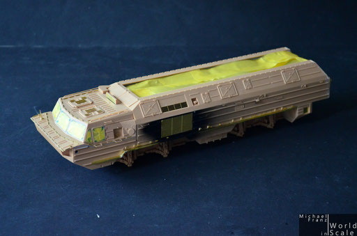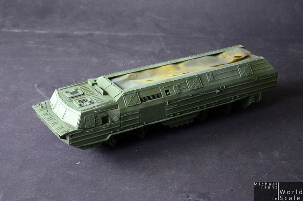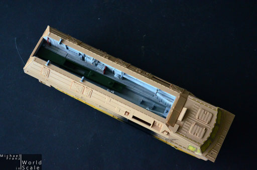Nach Fertigstellung der Abschusseinheit wird diese in den "Deckel" des Fahrzeugs eingeklebt. Die Scharniere auf beiden Seiten bleiben beweglich und halten später dann die bewegliche Abdeckung der Rakete. Anschließend wird die gesamte Einheit auf dem Fahrzeugrumpf verklebt, verspachtelt und verschliffen. Es folgen dann die weiteren Details wie Klappen, Deckel und Auspuffanlage, bevor dann weitere Kleinteile (Griffe, Ätzteile, Gitter, ...) angebracht werden.