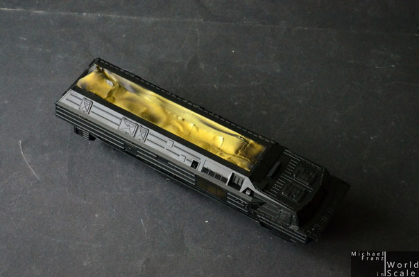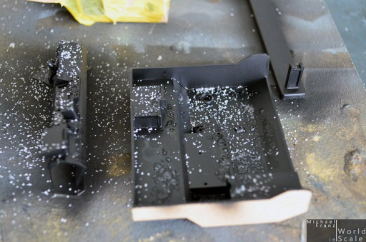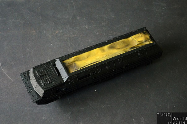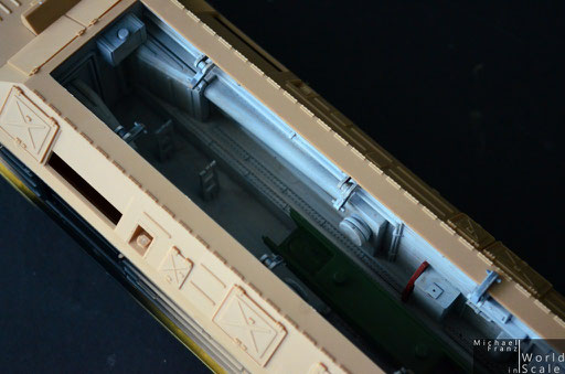 Sämtliche Kleinteile wie Handgriffe, Haken und Ösen, sowie diverse Gitter und Klappen werden anschließend montiert. Hierbei kommen sowohl Plastikteile und Ätzteile aus dem Bausatz, als auch Teile aus dem Zubehörset von Voyager zum Einsatz. Anschließend wird der bereits lackierte Innenraum maskiert, das Fahrzeug ist dann soweit vorbereitet für die Lackierung.
