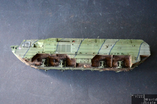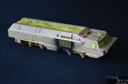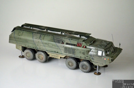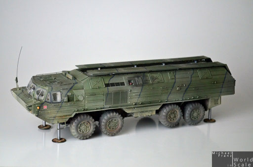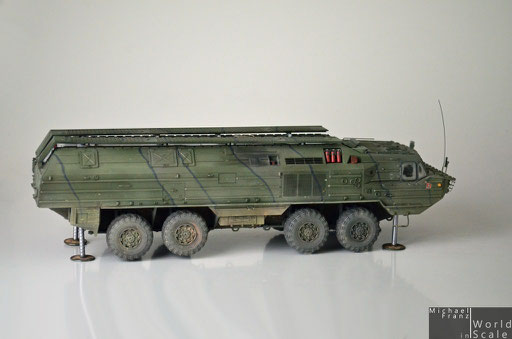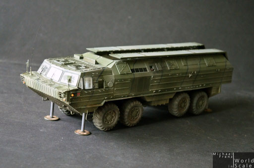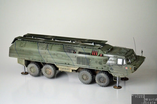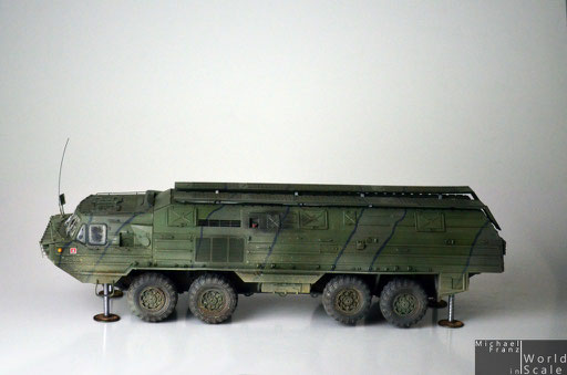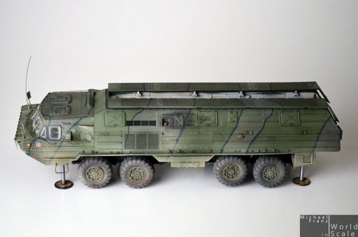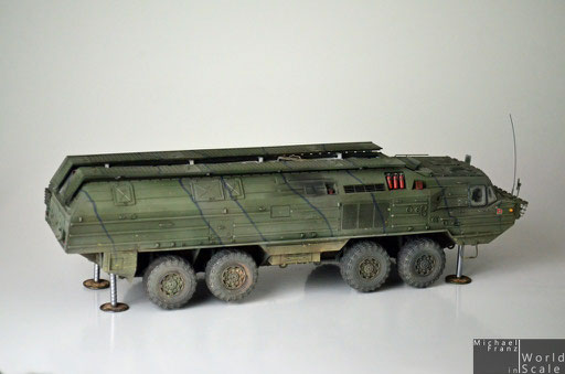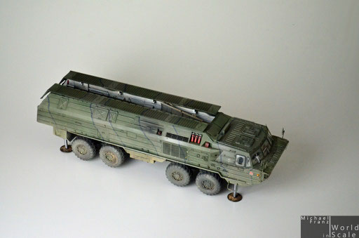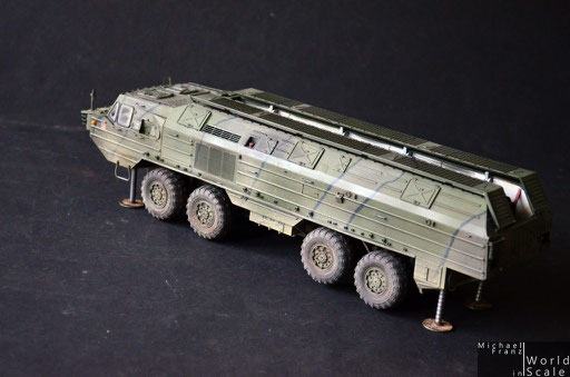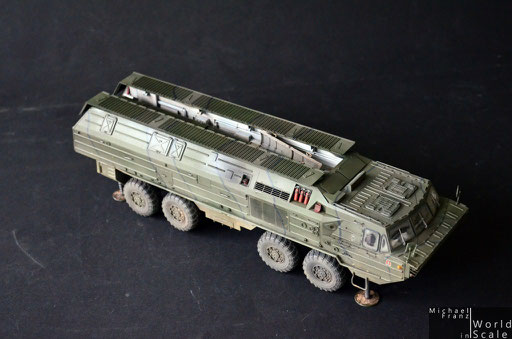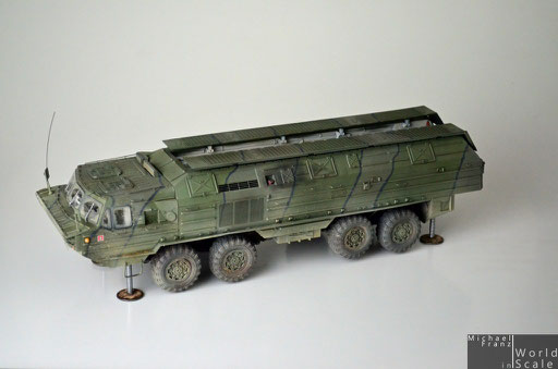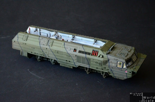 Es werden dann die Räder montiert, sowie weitere Kleinteile am Fahrzeug angebracht. Nach der Bemalung sämtlicher Scheinwerfer werden die Schutzgitter vorn aus Ätzteilen gebogen und montiert, bevor dann die lackierte und ebenfalls leicht mit einem Weathering versehene Rakete ihren Platz einnehmen kann. Die beiden Abdeckungen der Abschusseinheit werden geöffnet dargestellt, so dass ein steter Einblick ins Fahrzeuginnere erfolgen kann.