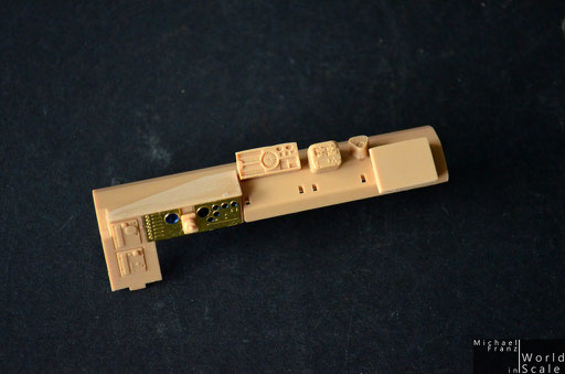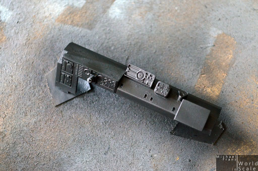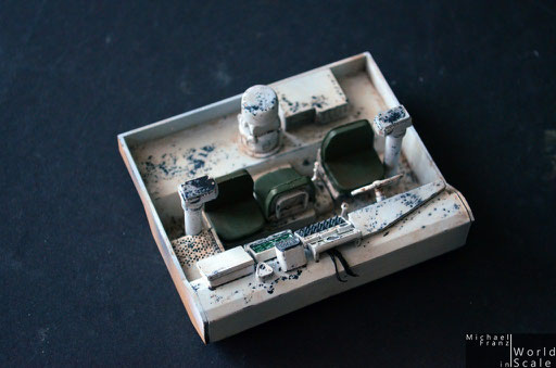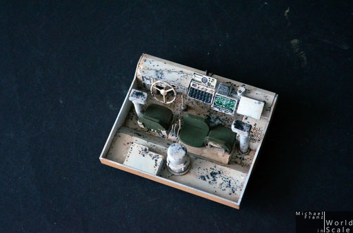 Der Bau des Modells beginnt mit dem Innenraum des Führerhauses. Dieser ist sehr gut wiedergegeben mit vielen Details und Einzelteilen. Durch die großen Fenster wird später der Innenraum sehr gut einsehbar bleiben, so dass einige zusätzliche Detailarbeiten erfolgen. Das Armaturenbrett erhält aus dem Voyager-Set Instrumente aus Folie, sowie eine fotogeätzte Abdeckung mit feinsten Details. In Baugruppen zusammengefügt, werden dann alle Teile nach ihrer Montage zunächst schwarz grundiert, nach dem Trocknen mit Salz maskiert und dann weiß lackiert und mit einem Washing versehen. Baubruppen sind Armaturenbrett, Bodengruppe, Sitze, Dach/Seitenwände sowie diverse Anzeigen / Instrumente und weitere später noch im Detail zu bemalenden Bauteile.