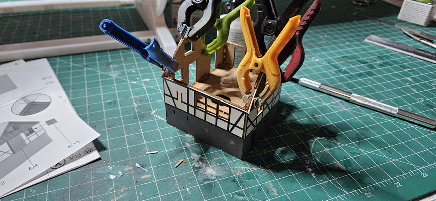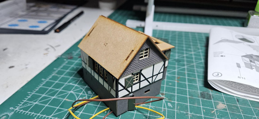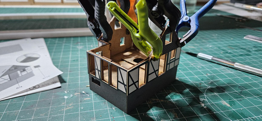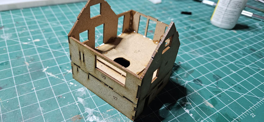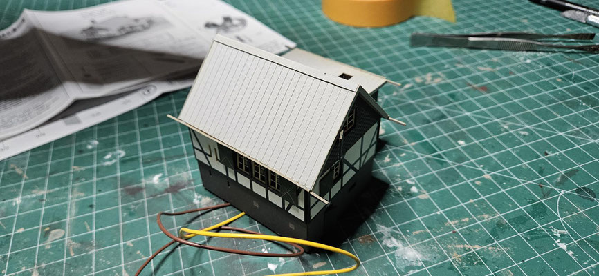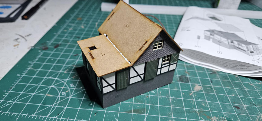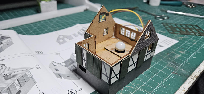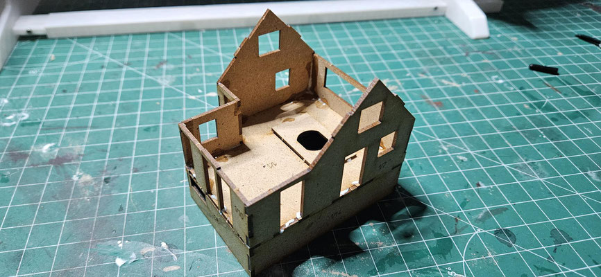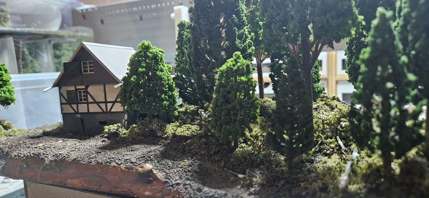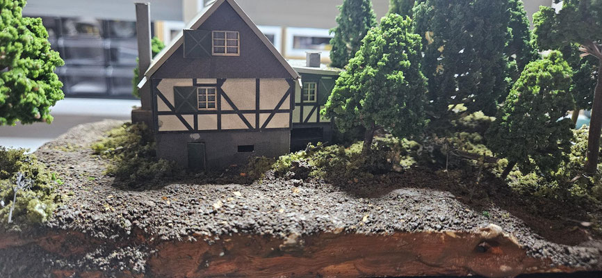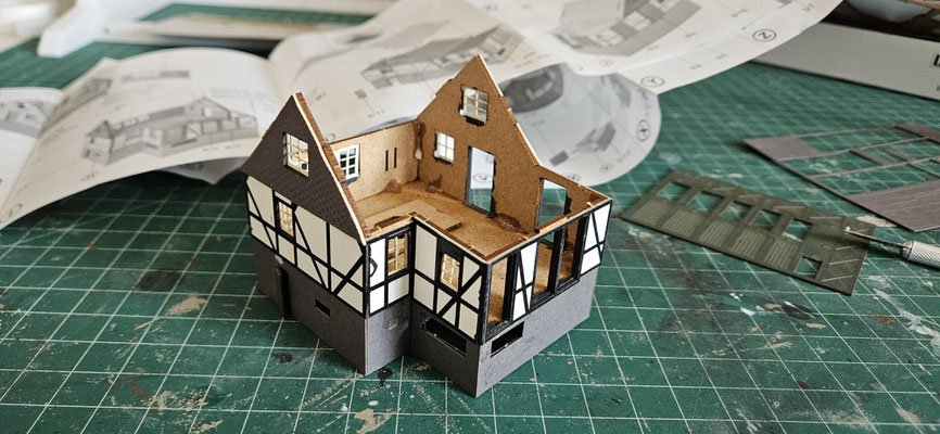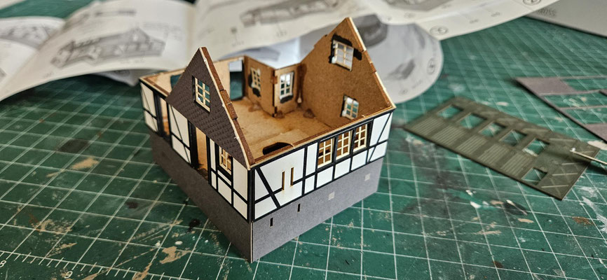 Lasercut-Modell einer Fachwerkhütte in Ständerbauweise über einem gemauerten Kellergeschoss nach einem Originalvorbild im Siegerland. Der Grundriss ist in zwei Zonen aufgeteilt, neben dem