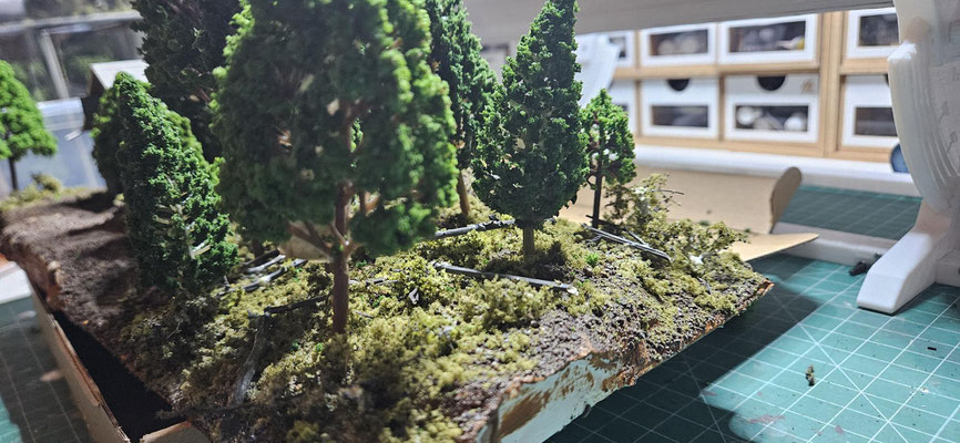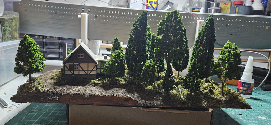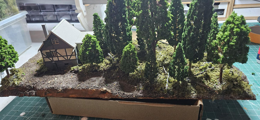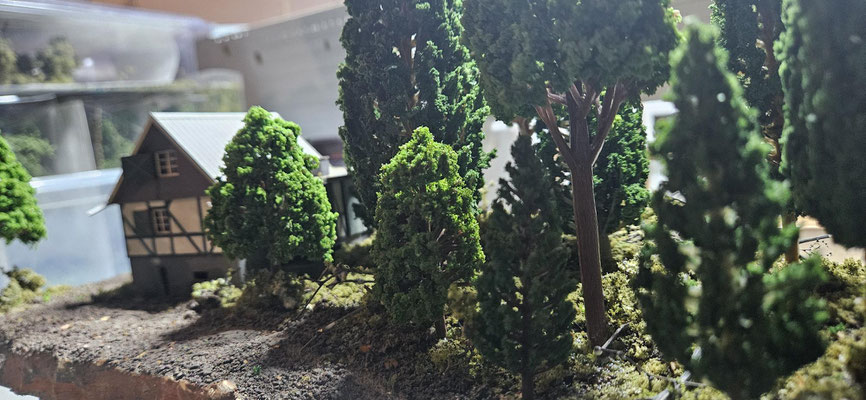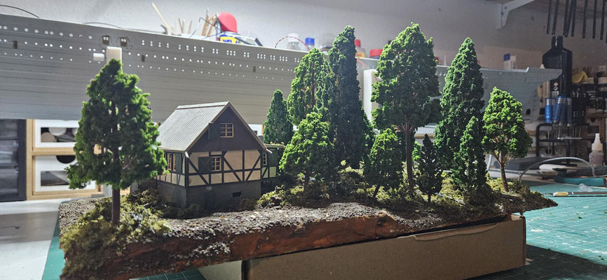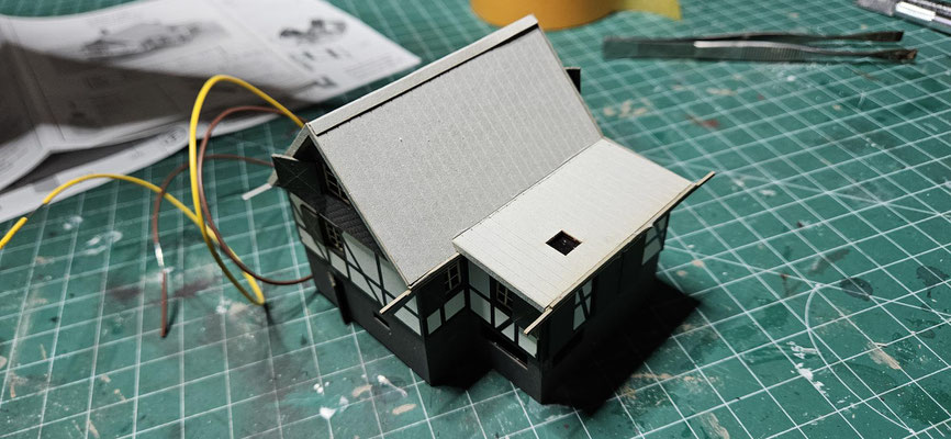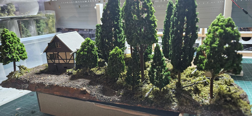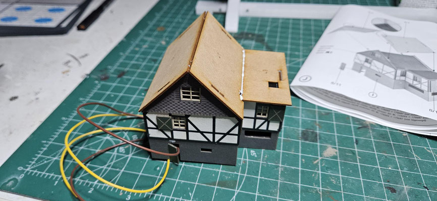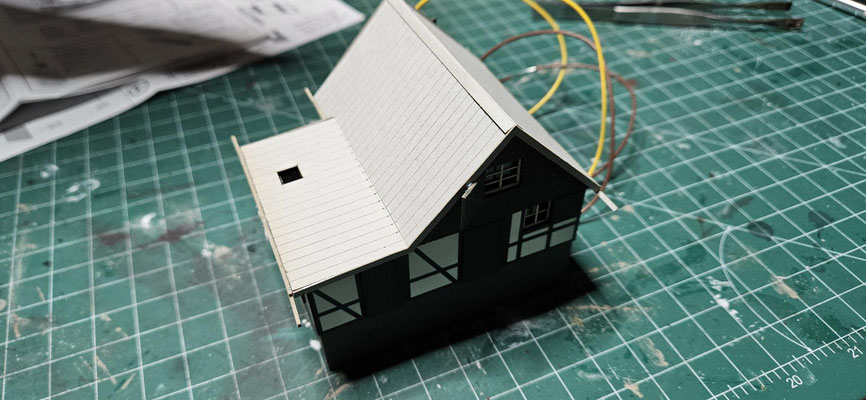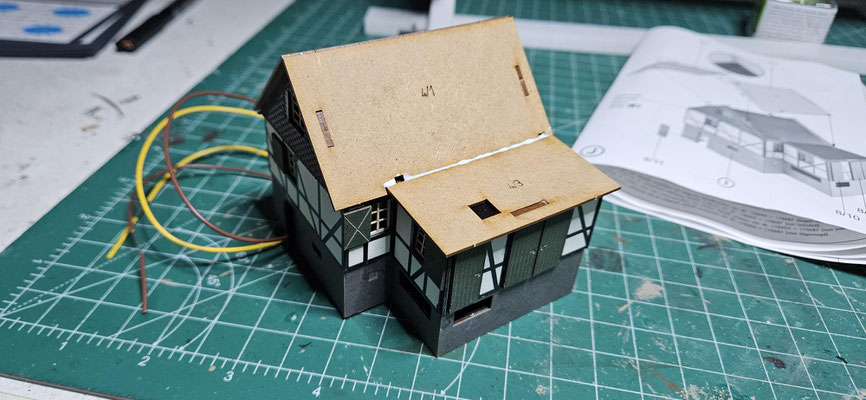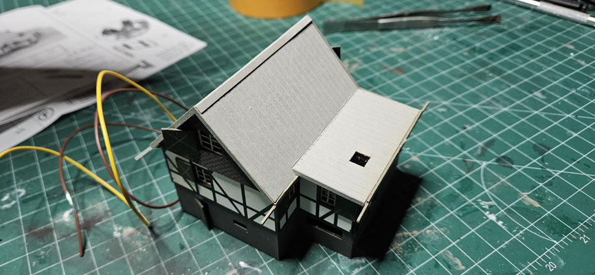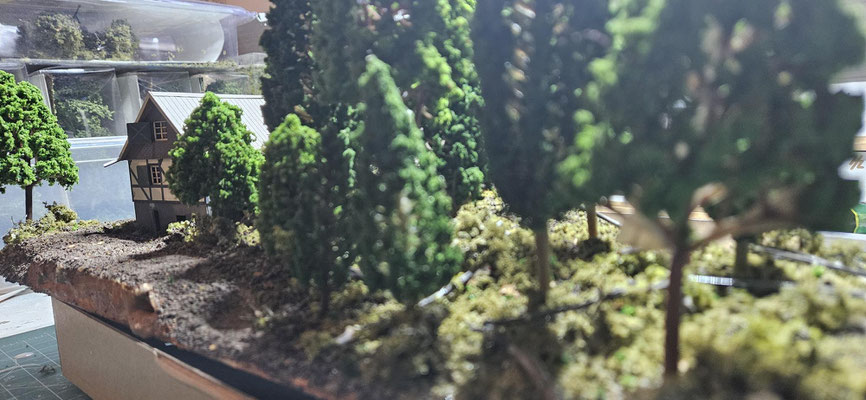 Lasercut-Modell einer Fachwerkhütte in Ständerbauweise über einem gemauerten Kellergeschoss nach einem Originalvorbild im Siegerland. Der Grundriss ist in zwei Zonen aufgeteilt, neben dem