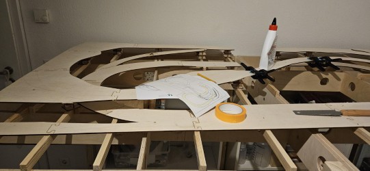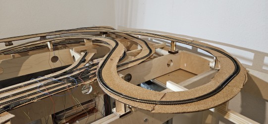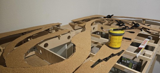 Alle Trassen werden nun noch mit 1mm starkem Kork ausgebettet, der einmal noch für eine ebene Oberfläche sorgt, vor allem aber für die Geräuschdämmung der Züge sorgen wird. Rollgeräusche der Loks