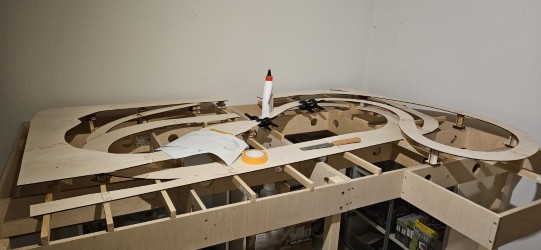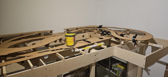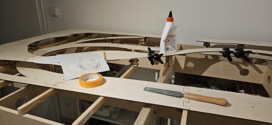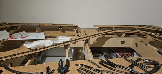 fixiert. Wie man sieht, sind einerseits Brücken noch nicht vorhanden, sowie im Bereich des späteren Viadukts noch die Trassen nicht ausgesägt. Der Bau und Einbau aller Brücken und Viadukte