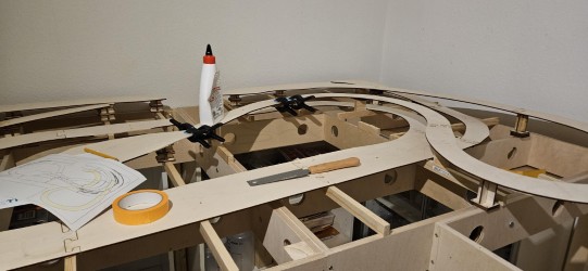 Holzsstützen, die über dem Rahmen des Unterbaus angebracht werden. In den offenen Bereichen werden noch Brücken eingesetzt werden, ebenso im inneren Bereich wird noch ein Stück der Trasse