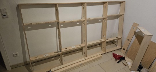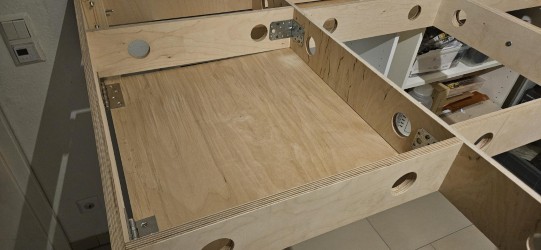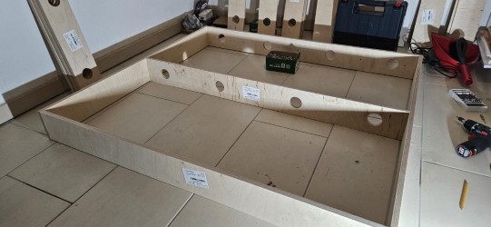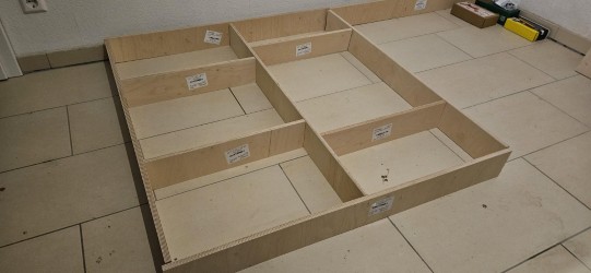 Passend zugesägte, 15mm starke Multiplexteile bilden die Basis für den Unterbau. Jeweils miteinander verklebt und verschraubt. Insgesamt entstehen drei separate Elemente, wobei diese allerdings