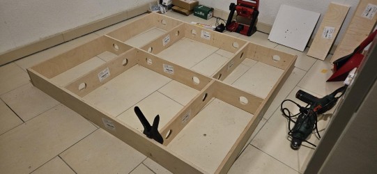 Aus den bereits vorbereiteten Multiplexplatten entsteht das Grundgerüst des Unterbau. Zunächst wird der Rahmen aus den 4 äußeren Teilen zusammengesetzt. 90°-Klemmen sind für den akkuraten Bau des