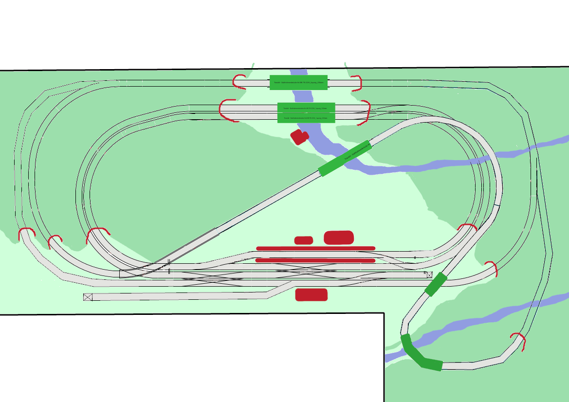 Nachfolgend der Gleisplan, wie er mit Änderungen aussehen wird. Landschaft in Dunkelgrün sind Berge, bzw. Erhöhungen. Hellgrün dargestellte Landschaft ist tieferliegend. Grün dargestellt sind