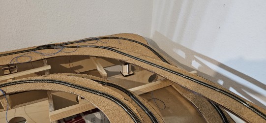 Es werden nun die Schienen von Minitrix erstmals auf den Trassen aufgebaut. Hierbei werden bereits die Anschlüsse für die Stromzufuhr über die spätere Ringleitung eingeplant, ebenso diverse